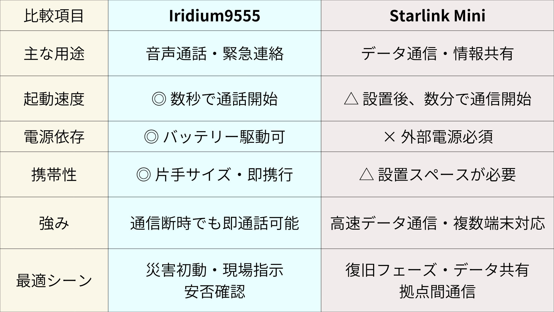 下表の通り、Iridium9555とStarlink Miniはそれぞれ得意分野が異なります。