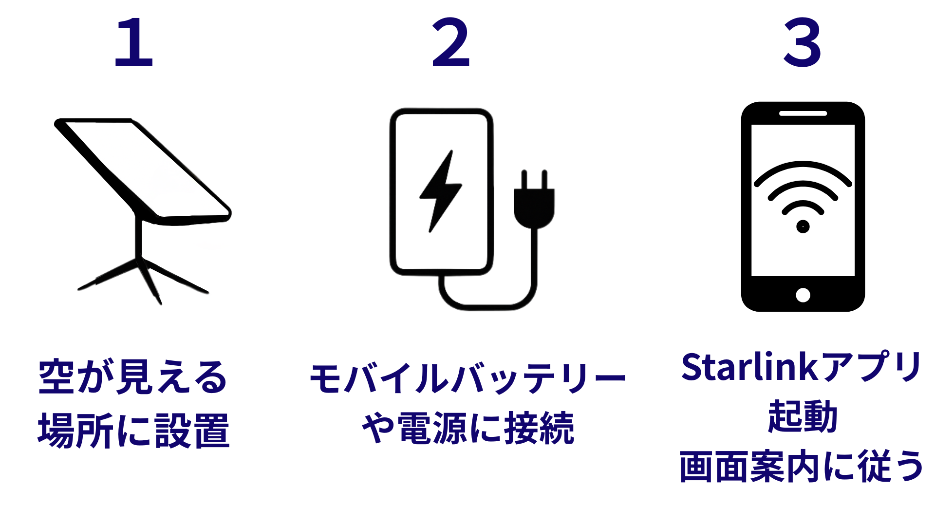 Starlink Miniの導入は、次の3ステップで完了します。専門知識は不要で、現場スタッフでも即時運用が可能です。