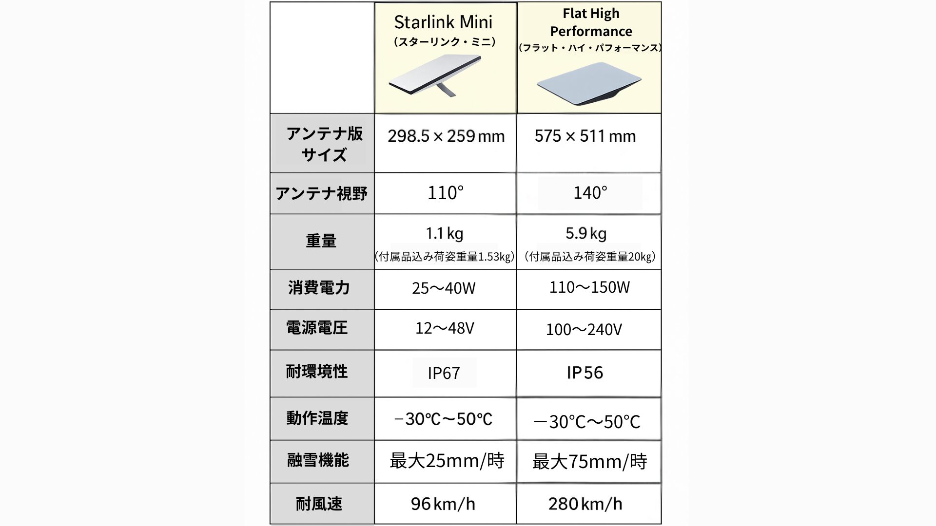 • Starlink Mini:小型・軽量で設置も簡単。携帯性や初期コスト重視の中小企業・自治体・仮設現場向け。モバイル電源でも運用可能。