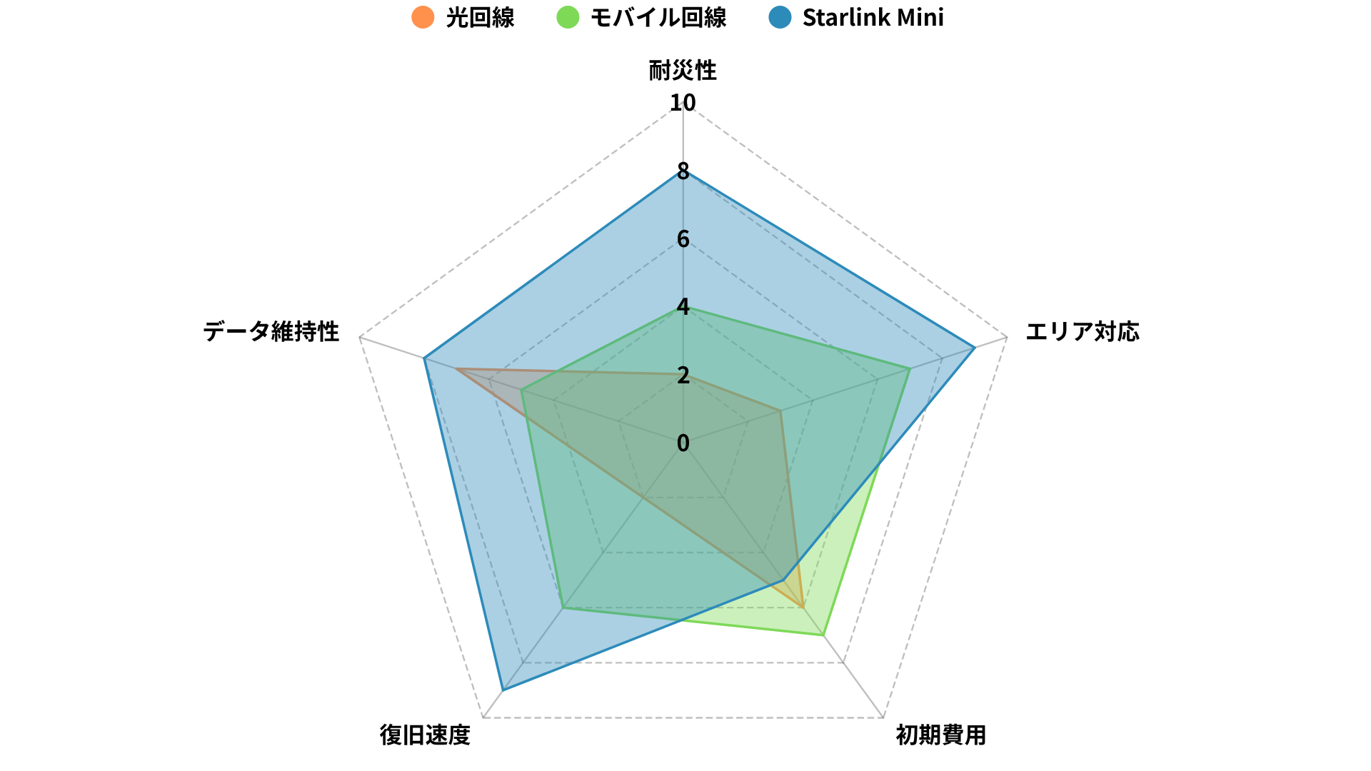 光回線・モバイル回線・Starlink Miniの3種を、災害時に重要となる5つの指標で比較しました。Starlink Miniは「エリア対応・耐障害性・復旧速度」の全項目で高スコアを記録し、災害初動における“通信の最後の砦”として信頼されています。