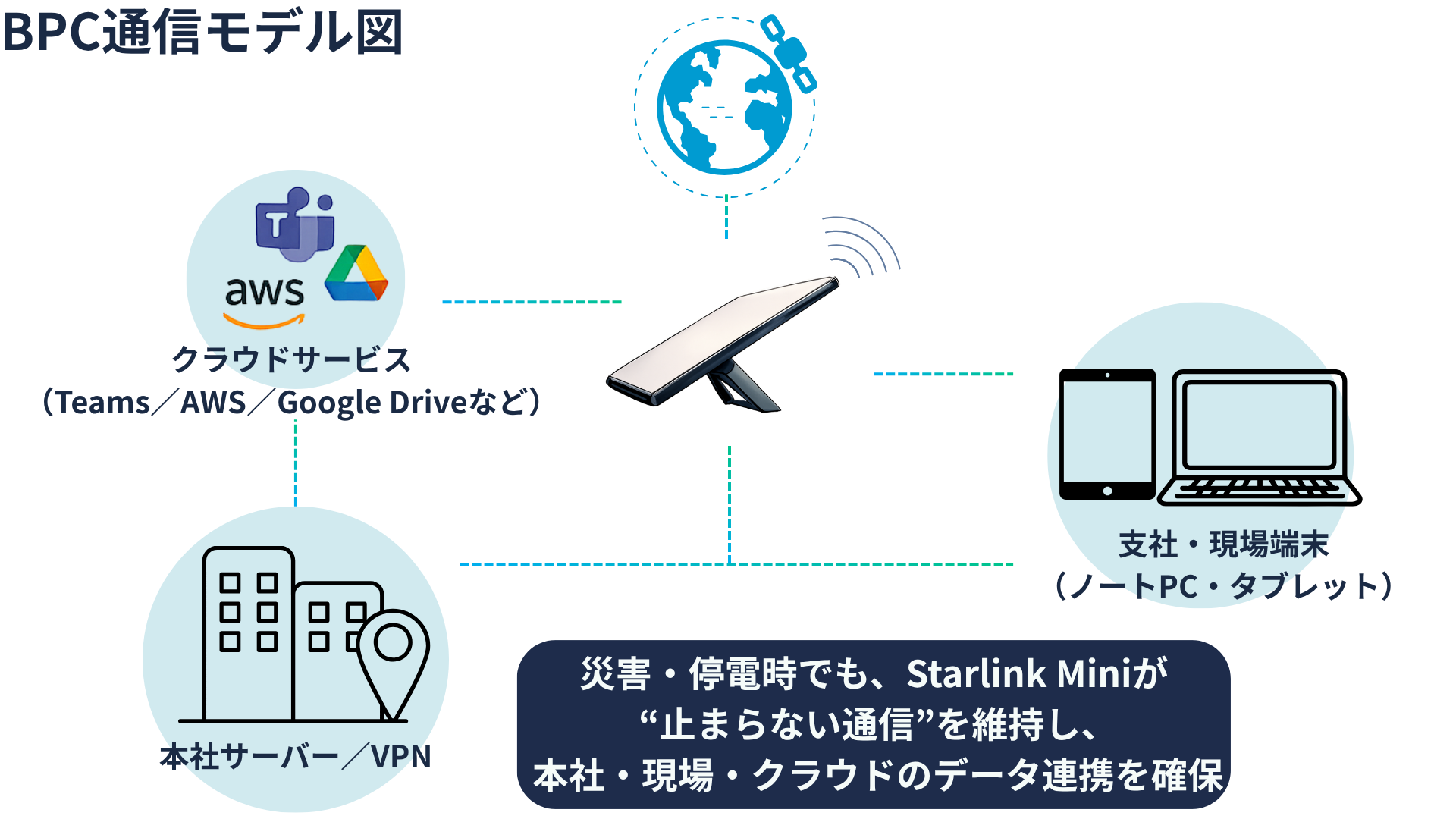 Starlink MiniをBCP拠点や支社に設置すれば、停電や断線時にもVPN接続やクラウド利用が継続可能。