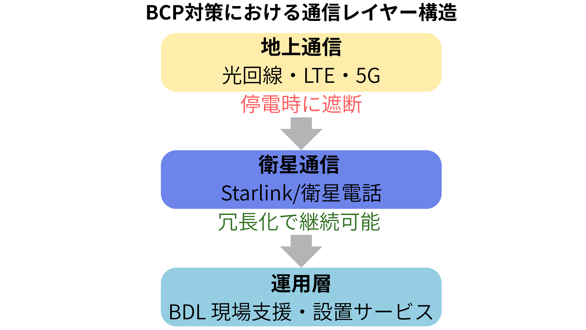 災害時に「どの通信が生き残るか」は、BCP対策の要です。 下図は、通信インフラを“階層化”したイメージ。 地上通信が止まっても、衛星通信レイヤーを組み込むことで業務継続が可能になります。