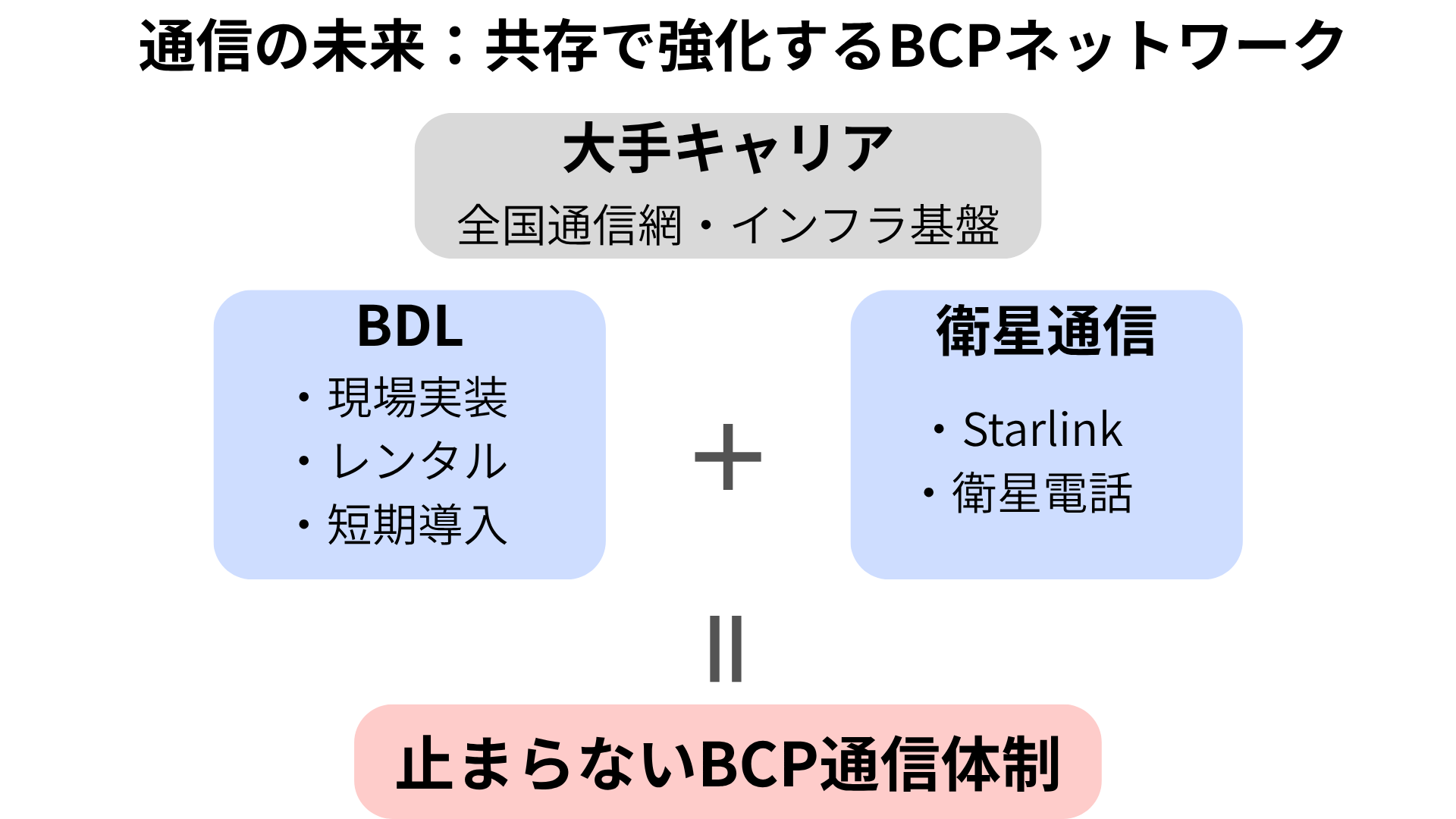 BDLは大手キャリアの“競合”ではなく、“共存パートナー”。 下図のように、インフラ+現場+衛星通信が組み合わさることで、どんな災害時でも“通信が途切れない社会”を実現します。大手通信キャリアは「日本の通信基盤」を支える存在です。