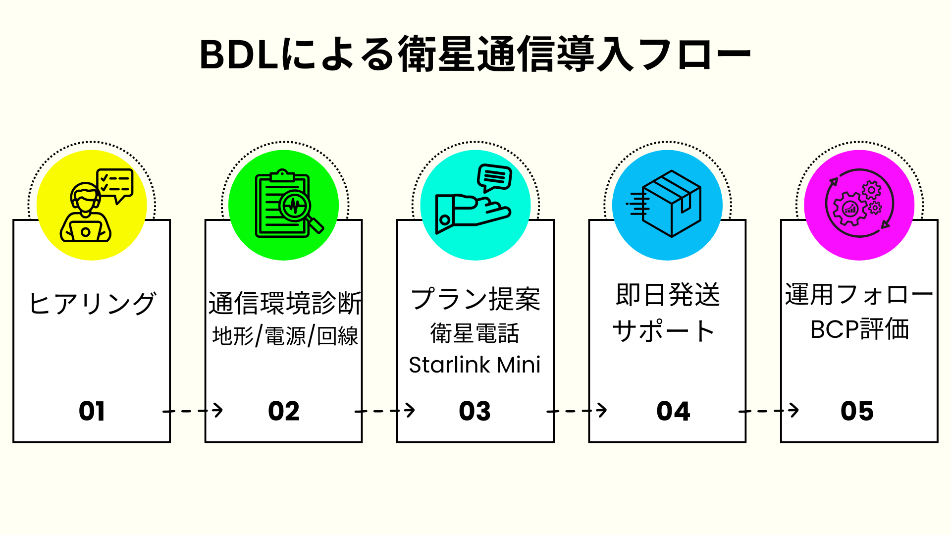 「導入が難しい」と思われがちな衛星通信も、BDLなら下図の流れでスムーズ。